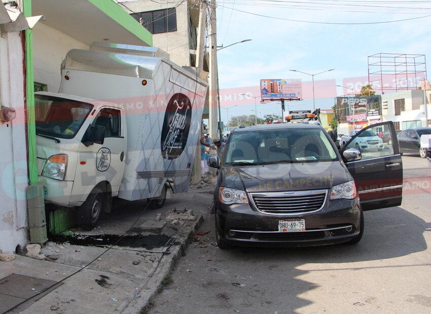 Al quedarse sin frenos, un camión impactó un poste de alumbrado público, otro de la Comisión Federal de Electricidad y contra una minivan que se encontraba estacionada en la avenida Francisco I. Madero; el vehículo se detuvo al chocar contra un predio.