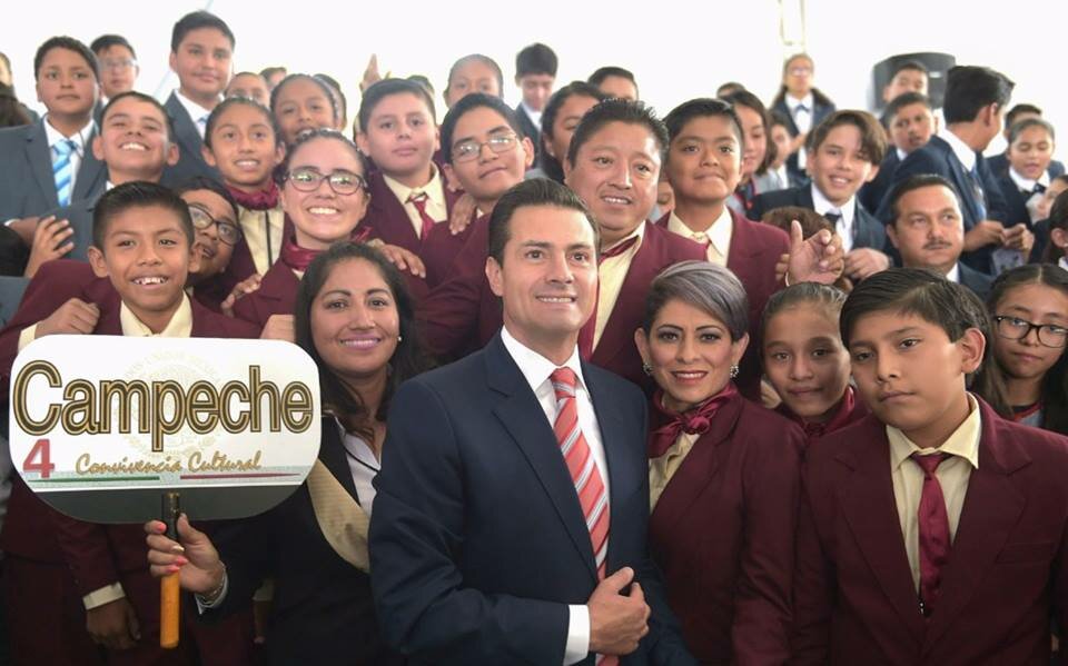 Alumnos campechanos ganadores de la Olimpiada del Conocimiento Infantil se tomaron la foto del recuerdo con el Presidente Enrique Peña Nieto, durante la Convivencia Cultural que se llevó a cabo en Los Pinos.