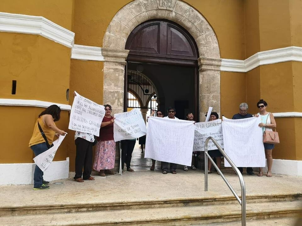Vecinos del barrio de Santa Lucía continúan con su lucha para que no se construya una gasolinera en la calle Villacabra entre 108 de dicho barrio y esta vez lo hicieron a los pies de las oficinas del H. Ayuntamiento de Campeche.