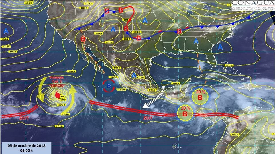 Para el día de hoy, dos zonas de baja presión con potencial para desarrollo ciclónico se localizarán, una al sureste de las costas de Quintana Roo, mientras que la otra al sur de las costas de Chiapas, lo cual generará en Campeche, un cielo nublado por la tarde con tormentas puntuales muy fuertes, que estarán acompañadas de actividad eléctrica.