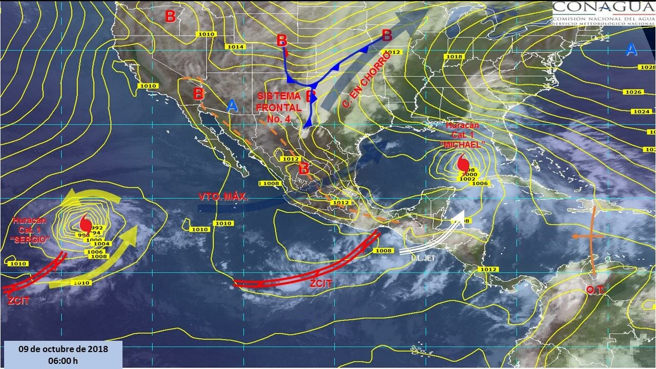 Por otro lado, el sistema frontal No. 4, se extenderá sobre el norte y noreste de México, ocasionará vientos fuertes y descenso de temperaturas en dichas regiones.