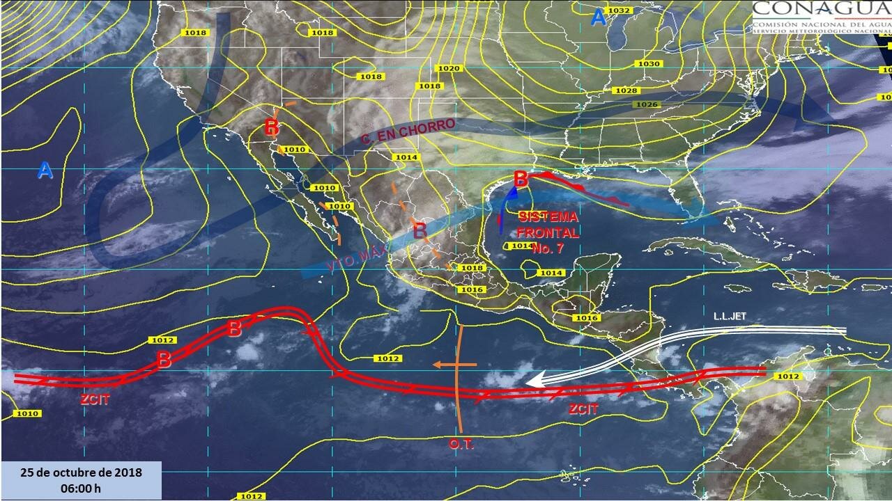 Para hoy, el frente No. 7, será reforzado por una nueva masa de aire frío, la cual originará un nuevo descenso en las temperaturas en estados del norte, noreste y oriente del territorio nacional, así como evento de “Norte” con rachas superiores a 50 km/h en las costas de Tamaulipas y Veracruz.