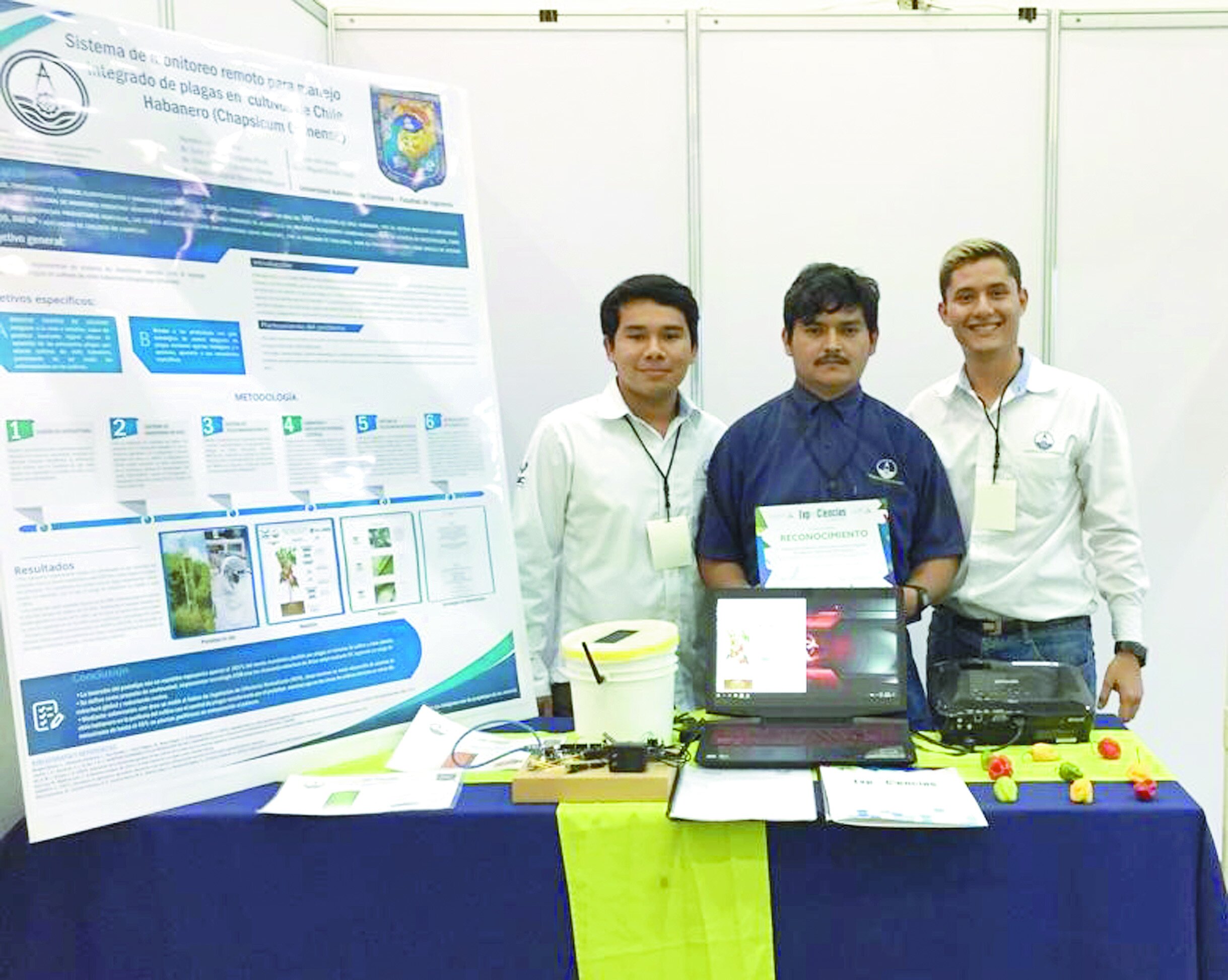 Los estudiantes Cristian Herrera Rodríguez, del séptimo semestre, César Julián Palmillas Gómez, de quinto semestre y Emir Mikjael Burguete Pech, de tercer semestre, con la asesoría de Juan Durán Lugo, presentaron el proyecto denominado “Sistema de monitoreo remoto para manejo integrado de plagas en cultivos de Chile Habanero.