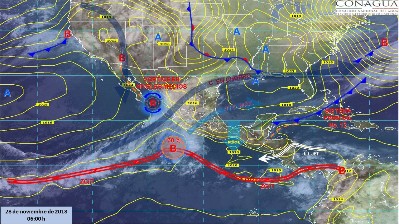 La masa de aire frío asociada a este frente frío empezará a modificar sus características, incrementando la temperatura diurna en gran parte del país, además mantendrá un evento de “Norte” con rachas superiores a 60 km/h en el Istmo y Golfo de Tehuantepec.