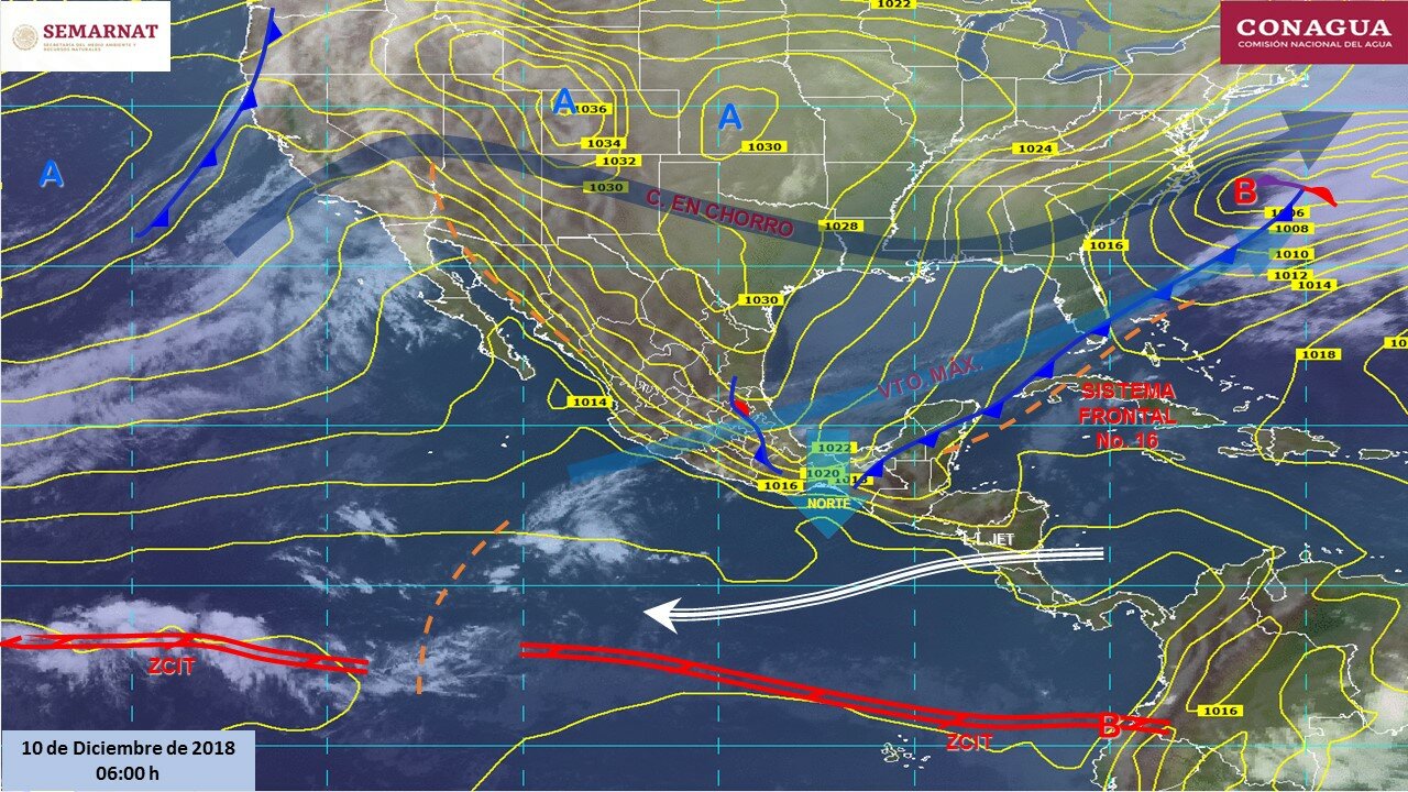 El frente frío número 16 y una masa de aire frío del norte seguirá causando vientos de hasta 60km/h.., con intervalos de chubascos con tormentas puntuales fuertes en el estado.
