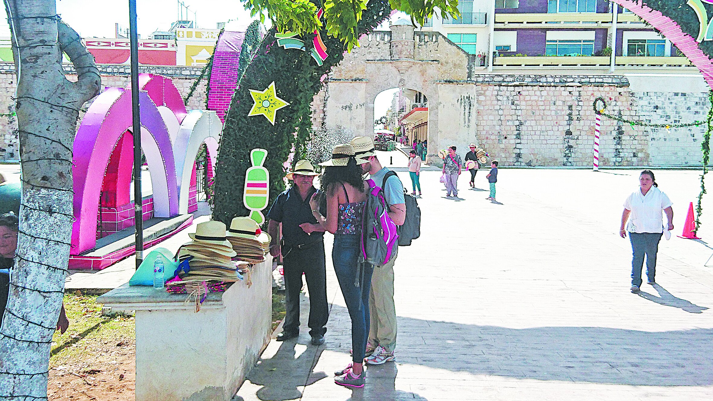 En el Parque Principal se puede notar la afluencia de turistas tomando sus postales de recuerdo, teniendo de fondo la Catedral de Campeche, visitando la Casa Número 6; los museos como el del Baluarte de la Soledad y el Centro Cultural.