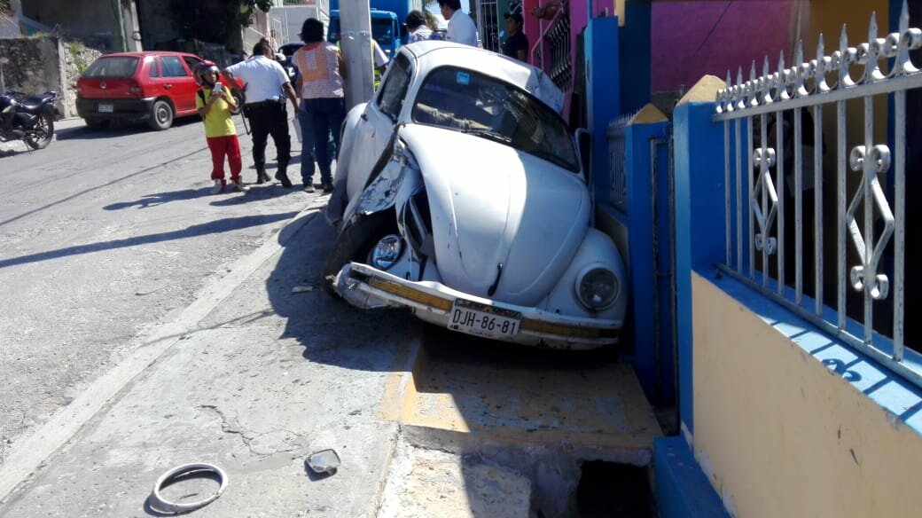 Al quedarse sin frenos un automóvil descendió una cuesta y estuvo a punto de arrollar a un motociclista, además de chocar contra un poste de la Comisión Federal de Electricidad (CFE) y un predio de la colonia Jardines.