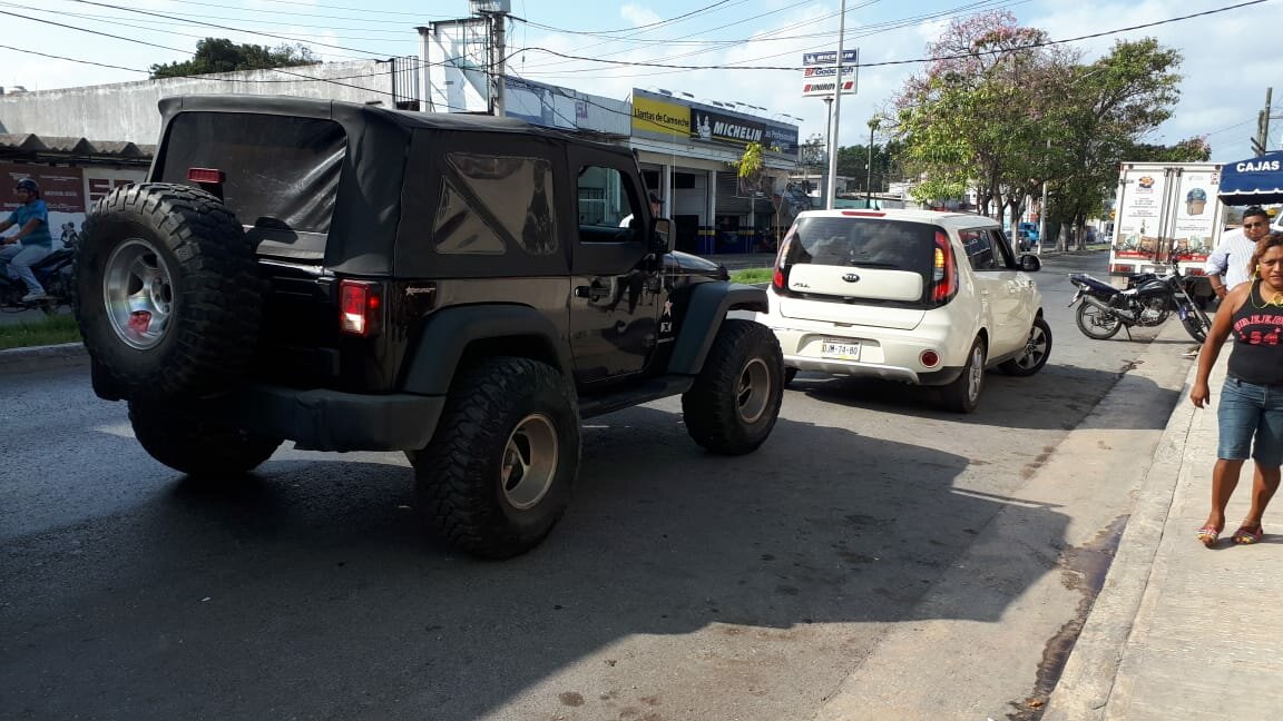 Al llegar al cruzamiento de las calles Brazo y Allende, la conductora de la Wangler cambió de carril, por lo que la llanta delantera impactó la parte trasera del Kia.