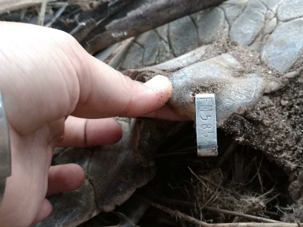 Al llevar a cabo la revisión de las aletas de la tortuga se encontró una marca de acero tipo ‘inconel’ en la aleta izquierda con número de serie FM585; este acontecimiento expone la importancia del programa de marcaje de tortugas marinas en el Estado, destacó el Subdirector de Vida Silvestre de la Secretaría de Medio Ambiente y Recursos Naturales del Estado (Semarnatcam), Jorge Berzunza Chio.