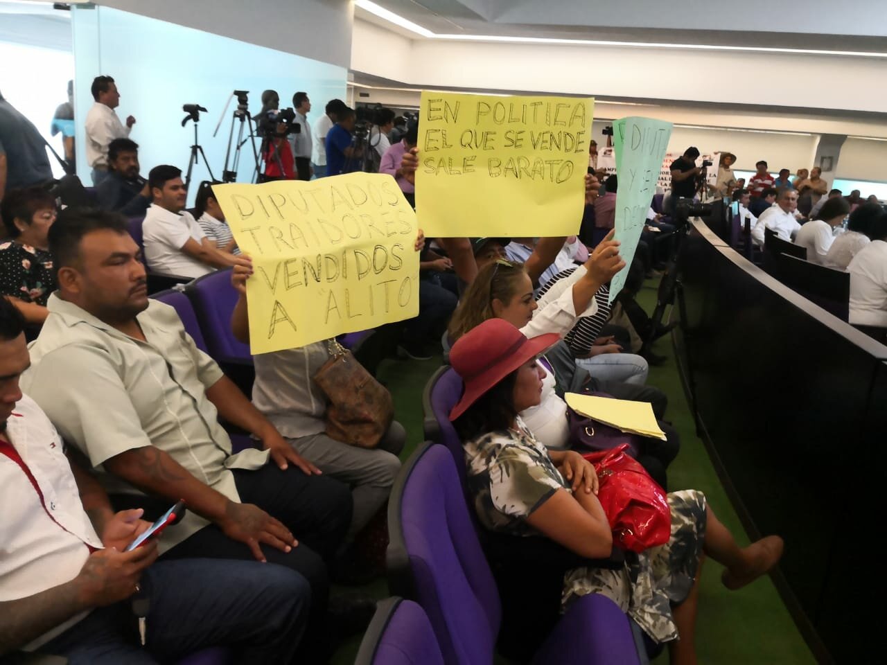 Acompañados por un grupo de simpatizantes de Morena, entre ellas la consejera Carmen Molina Chablé, Gladys Zavala arremetió contra Flores Pacheco en medio de la sesión, con pancartas en mano donde acusaba de tener metidas las manos en el partido y que, derivado de ello, propicio su presunto despido.