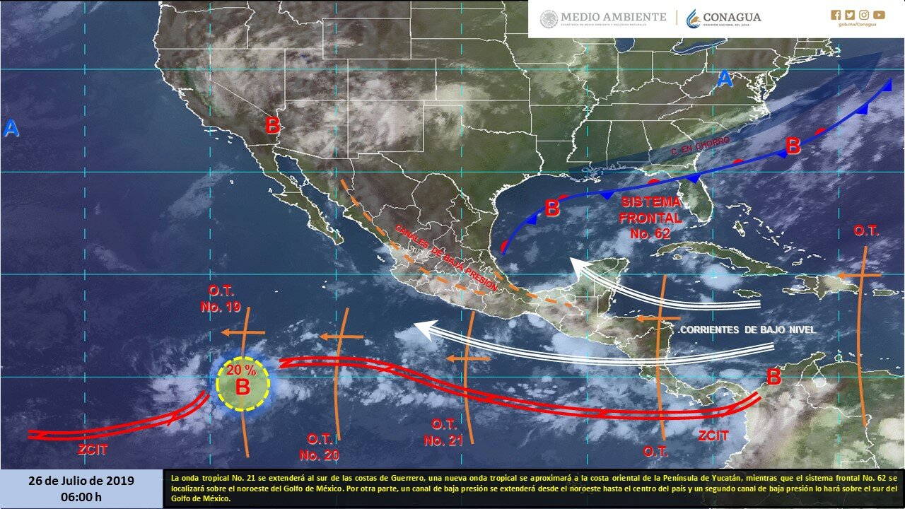 Para hoy, la onda tropical No. 21 se extenderá al sur de las costas de Guerrero, una nueva onda tropical se aproximará a la costa oriental de la Península de Yucatán, mientras que el sistema frontal No. 62 localizará sobre el noroeste del Golfo de México.
