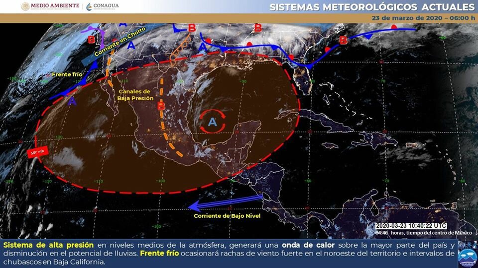 Para hoy, un sistema de alta presión en niveles medios de la atmósfera, generará una onda de calor sobre la mayor parte del territorio nacional y disminución en el potencial de lluvias.