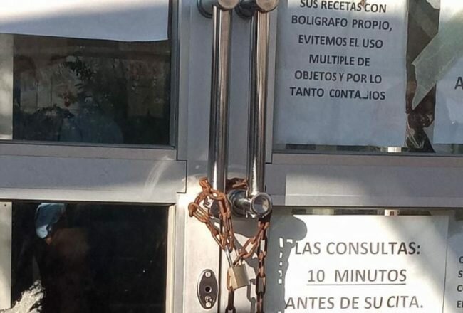 Derechohabientes asistieron al centro de salud a recibir atención médica así como medicamentos desde muy temprana hora, sin embargo, pasaron gran coraje cuando salió el guardia de seguridad a informarles que solo se entregarían 5 fichas para consulta, a lo que ellos respondieron, entre dimes y diretes, colocando una cadena de acero entre ambas puertas de la entrada principal.