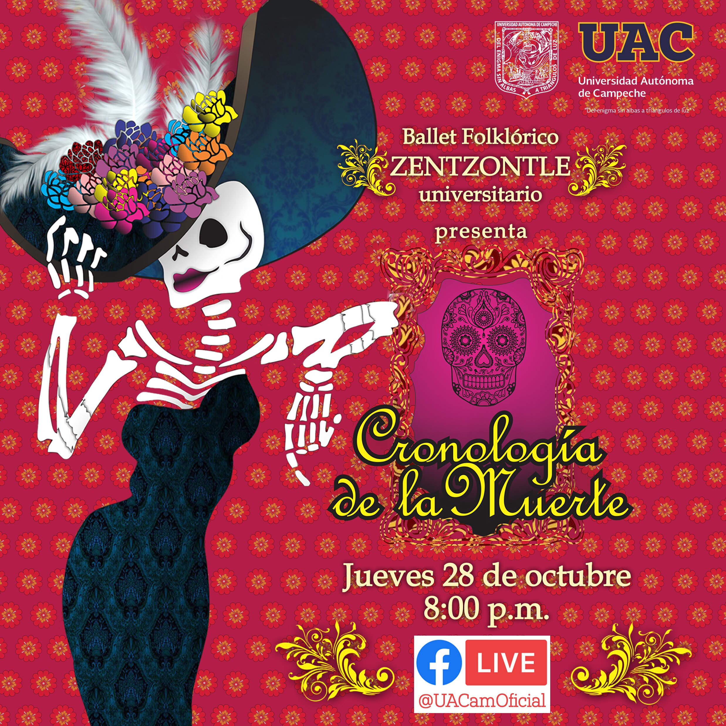 La Dirección General de Difusión Cultural de la Universidad Autónoma de Campeche transmitirá en vivo, a través de sus redes sociales, el día de hoy a partir de las 20:00 horas, el espectáculo “Cronología de la Muerte” a cargo del Ballet Folclórico Zentzontle Universitario, bajo la dirección del maestro Isaac Villegas Rodríguez.