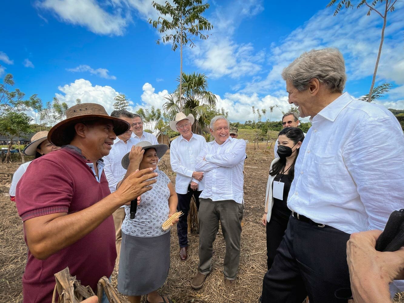 Ante el presidente López Obrador, el enviado especial del presidente Biden expresó que reconoció el esfuerzo del gobierno de México en contra de cambio climático y destacó su visita a esta parcela que cultiva el señor Carmelino Cruz, quien también