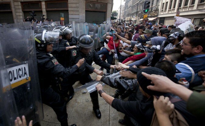 Manifestantes chocan con la policía antimotines durante enfrentamientos en la Ciudad de México durante la juramentación de Enrique Peña Nieto como nuevo presidente el sábado 1 de diciembre de 2012. (AP foto/Eduardo Verdugo)