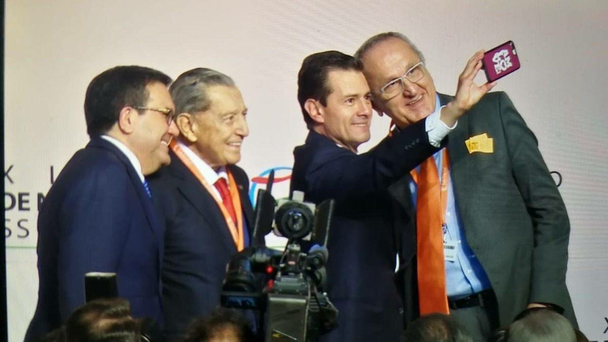 El presidente Enrique Peña Nieto participó este lunes en la Cumbre de Negocios 2018, en donde se tomó una selfi con el empresario Miguel Alemán, el secretario de Economía, Ildefonso Guajardo, y el negociador de López Obrador en el T-MEC, Jesús Seade.