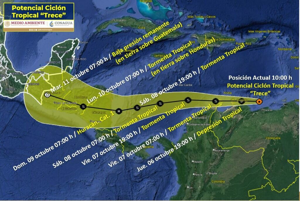 El potencial ciclón tropical número 13 se encuentra en la costa de Venezuela, se espera que en el transcurso de los próximos cinco días se interne en el Mar Caribe y esto va a favorecer que se dirija a Nicaragua, posterior Honduras y Guatemala, por lo que no representa un riesgo para el país.