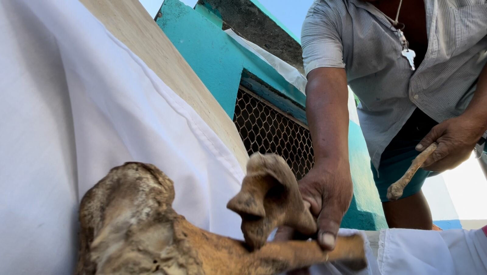 Luego proceden a realizar el cambio de paño blanco que, con meses de anticipación bordan con nombres de los fallecidos o flores, otros son pintados a mano, para luego acomodar en el osario o caja de madera cada uno de los huesos que van limpiando con delicadeza.