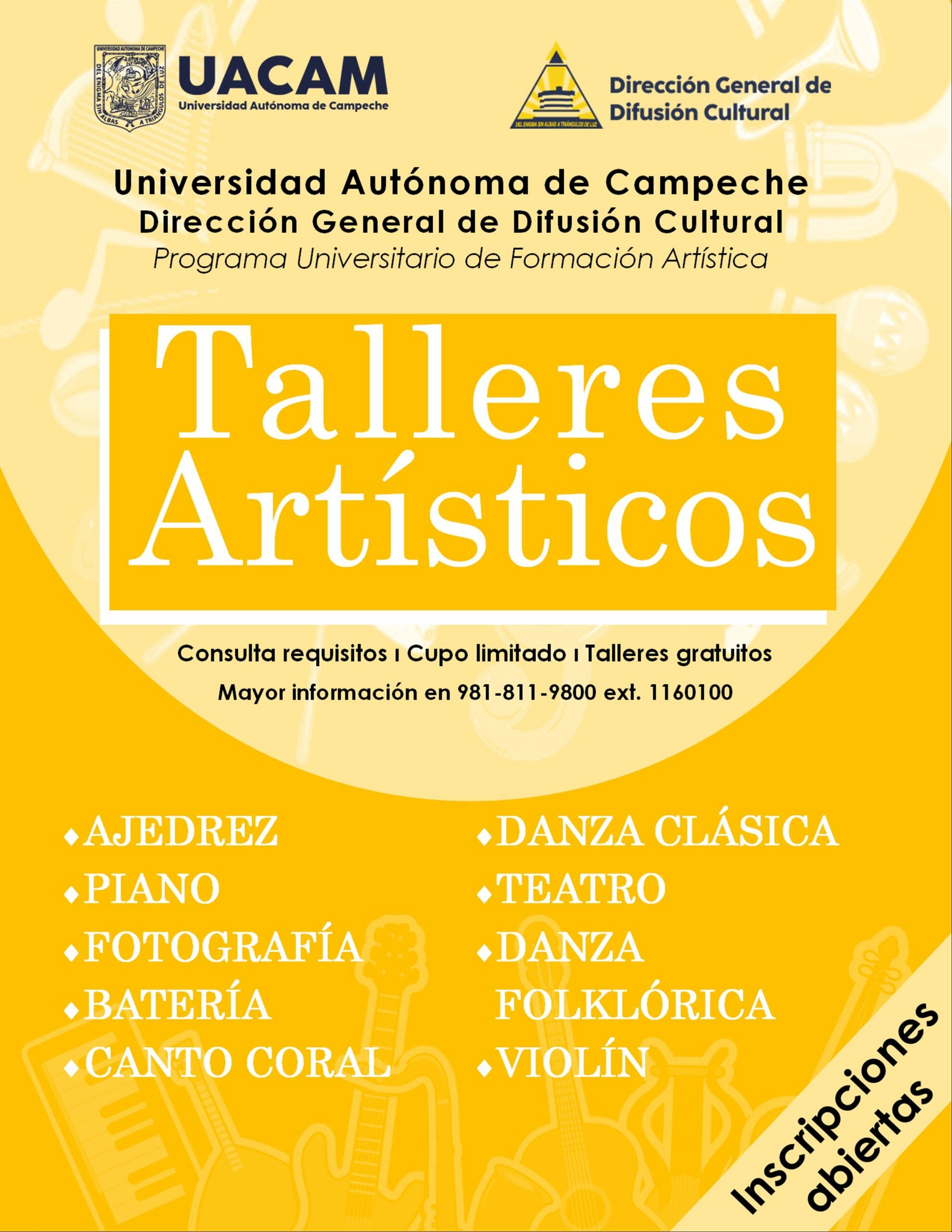 La Dirección General de Difusión Cultural de la Universidad Autónoma de Campeche dio a conocer la convocatoria para acceder a los talleres de su Programa de Formación Artística, dirigida a miembros de la comunidad universitaria e hijos de trabajadores de la institución.