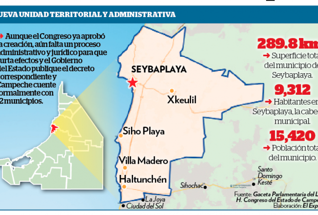 Tal como ayer lo anunció EL EXPRESO, este jueves el Congreso del Estado aprobó la creación de Seybaplaya como el doceavo municipio de la entidad, aunque su formal constitución aún requiere de la aprobación de los cabildos de los otros municipios y del decreto que en su momento firmará el Gobierno del Estado, lo cual se considera como mero trámite.